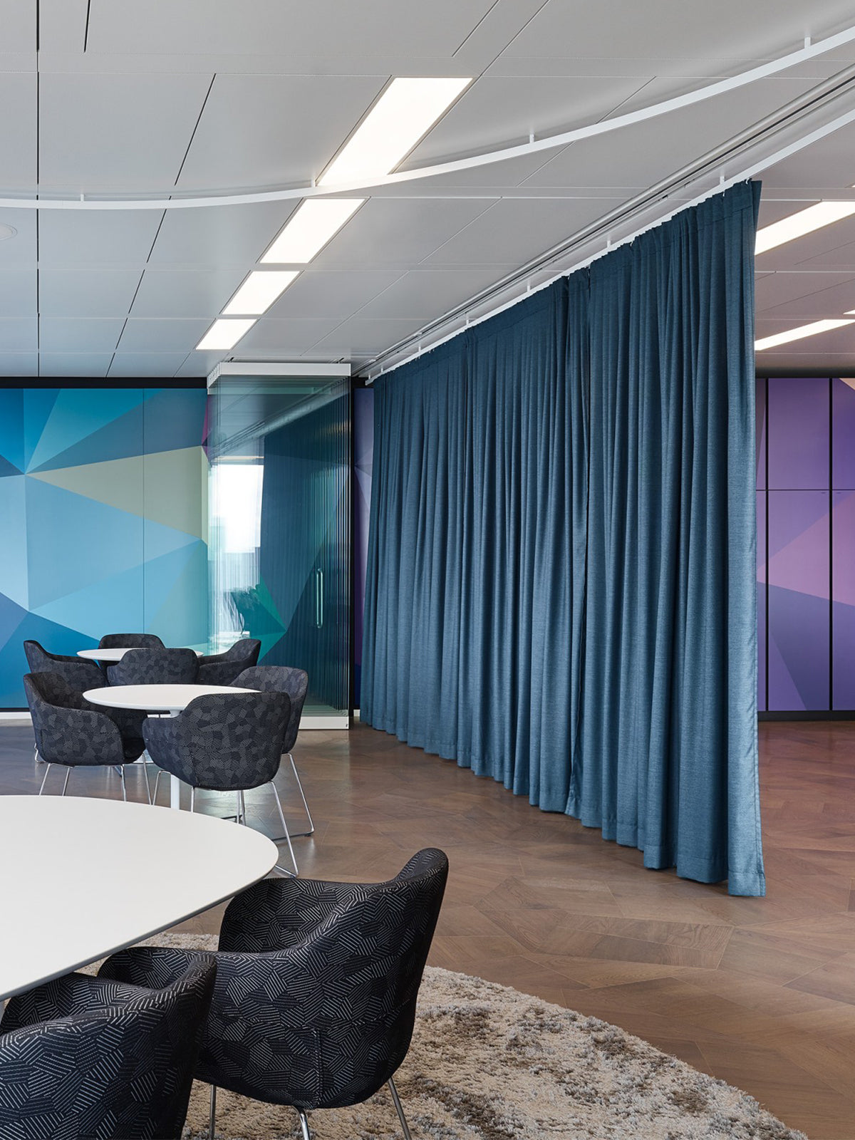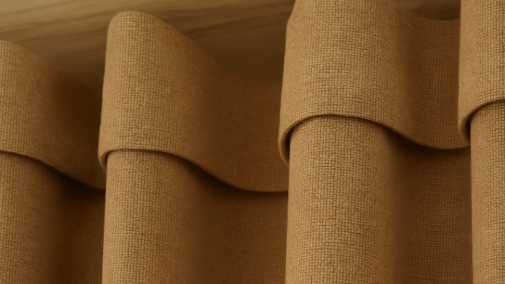 På lydgardiner der hænger frit i rummet, syr vi poteirhoved og franske sømme, der sikrer at gardinet er flot såvel forfra som bagfra.